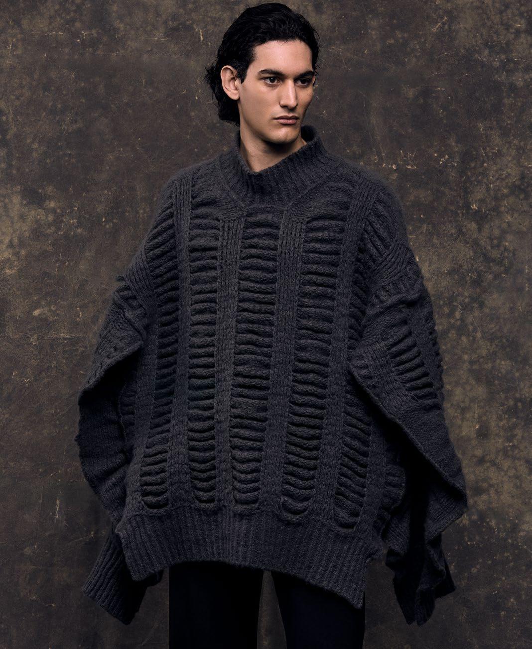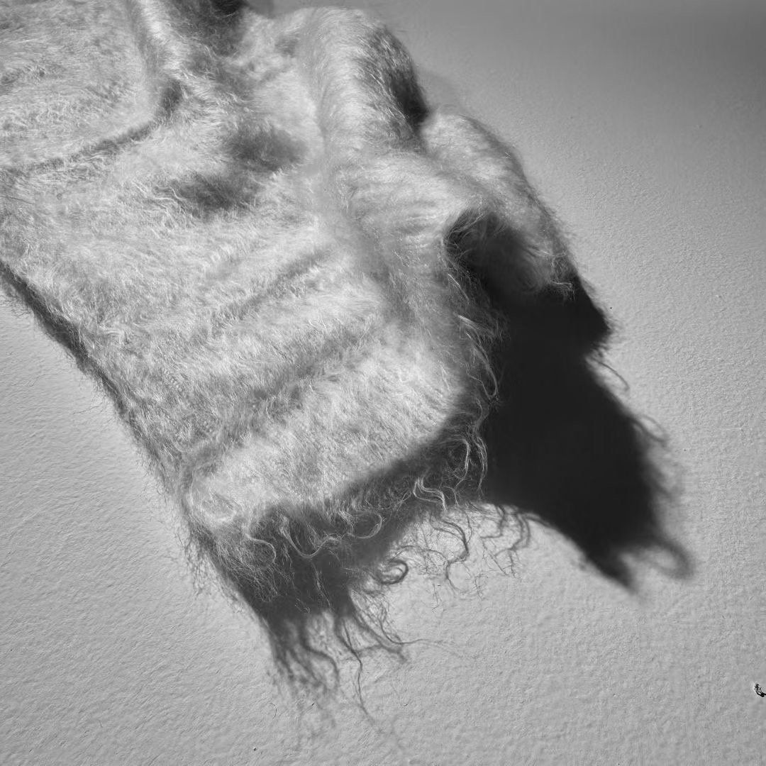 全系列手工打造,甄选羊绒、羊毛等珍贵原料,以纤维本真色彩为主,极简点缀衔接传统与创新,简约却惊艳。羊绒薄纱覆于毡化外套,完美复刻文艺复兴雕塑的冷暖交织;羊毛细绒混纺手工大衣,尽显匠心;两款超大针织衫各具特色,或如云絮柔软,或流苏灵动,兼顾美观实用;三款牧民斗篷是整场展览的“灵魂之作”,以不同材质演绎自然粗犷与温柔质感,诉说跨越地域的工艺故事;两件2.5米高巨幅挂毯装置令人惊艳,或以流苏造银河之姿,或跨界重构墙面艺术,打破服饰与装置的边界,重构工艺之美;水洗毡化羊绒面料打造的和服式外套,柔中带刚。康赛妮将纤维的潜能,在PITTI UOMO的舞台上发挥到极致。
